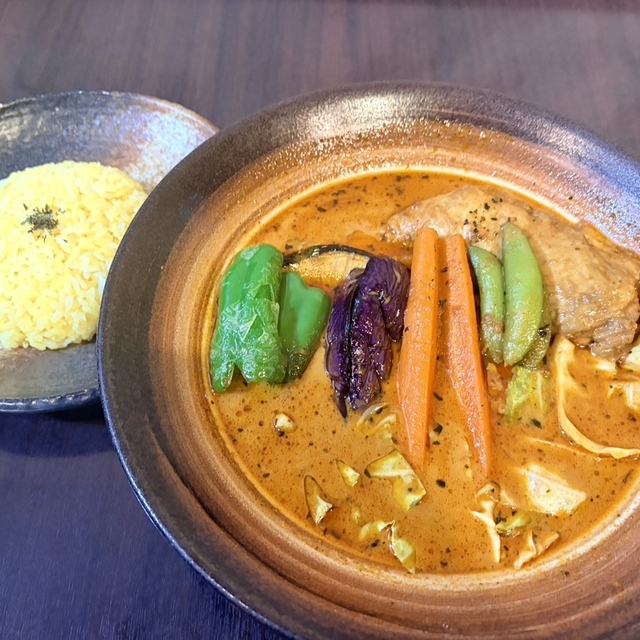 お店のイチオシメニュー。スープカレーは、北海道産の豚骨・鶏ガラ・野菜を12時間以上煮込んだブイヨンとスリランカから直輸入した約30種類のスパイスを合わせたもので野菜は甘みが強く、じっくりと煮込んだチキンはとろけるようなやわらかさです。