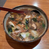 モヤシを始めとした新鮮な野菜をラードで炒めて特製の餡掛けスープと和えたお店の名物ラーメン。