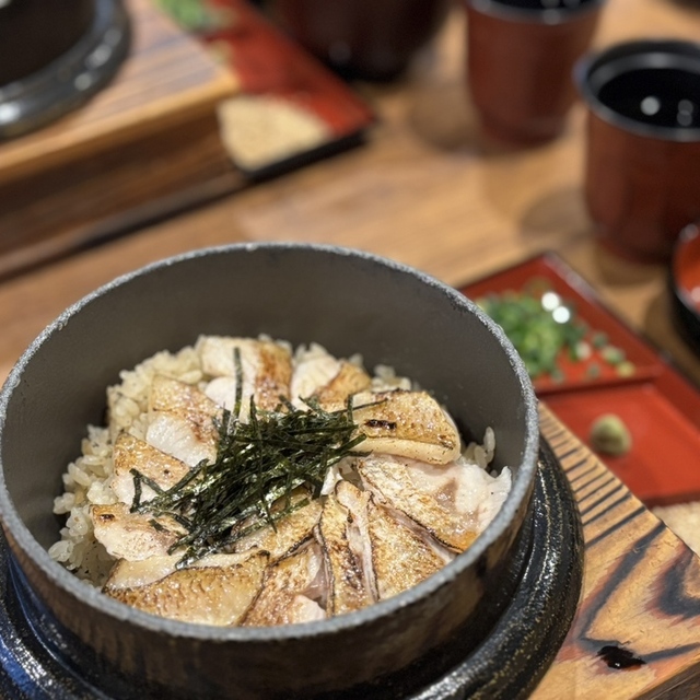 お店の名物。金沢を代表する高級魚のどぐろを厚めに切り、地元産の甘みの強い味噌、生姜、柚子こしょうをきかせた特製の炊き込みご飯の上にたっぷりと敷き詰め、最後にバーナーで皮目をカリカリに焼き上げのどぐろの甘みを極限まで引き立たせた贅沢な丼。シメはのどぐろの骨をカリカリに焼き、とろとろになるまで6時間煮込んだだし汁をかけてお茶漬けでいただきます。
