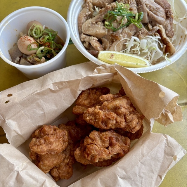特製の甘辛ダレで炒めた豚肉、生姜ニンニクダレで炒めた唐揚げ、チキン南蛮、キムチをのせた丼。