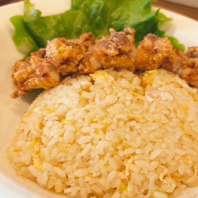 17年前に料理長が考案したオリジナルメニュー。松本の名物、醤油とニンニクを混ぜ合わせた醤油ダレに一晩漬けこんだ大判のもも肉をまるまる揚げた山賊焼きをチャーハンの上にのせた多い時には8割のお客さんが注文する大人気の一品です。チャーハンの具材は、玉子とネギのみとシンプルで鶏肉の濃厚な味わいをより引き立てています。