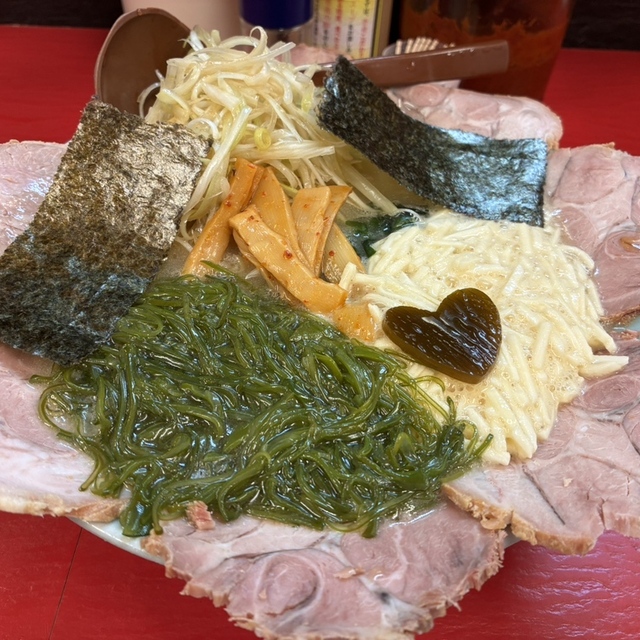 チャーシュー満開!とろとろのチャーシューがたっぷりのったボリューム満点な一番人気メニュー。80㎏の豚骨を5種類の野菜と一緒に煮込み、旨味を抽出したスープ。チャーシューは、このスープの中に豚肩ロース肉を投入して作っています。完成した豚骨スープと自家製醤油を合わせたスープに麺は、中細麺を使用しています。チャーシューの他、わかめ・メンマ・海苔がトッピングされてます。