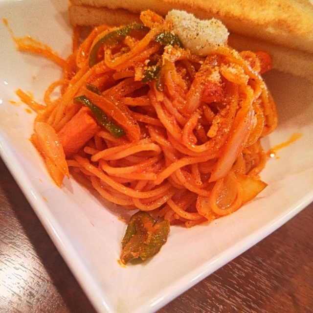 雑誌などの媒体では二郎系ナポリタンとも呼ばれている太麺で昭和な味のナポリタン。ソースは、ケチャップにトマトソースを少し加えて水分を多くして麺に絡みやすく、麺は1.6㎜の乾麺を固めに茹でてから扇風機で冷やして一晩寝かせておりモチモチのアルデンテに仕上げています。ナポリタンの上ににんにくをのせ、パンが添えられています。