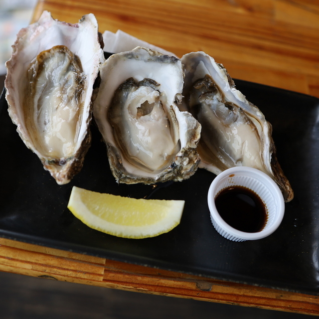 釧路駅から車でおよそ50分、最寄りの厚岸駅からは300mほど、厚岸湾の目の前に建つ道の駅「厚岸味覚ターミナル・コンキリエ」の中にある炭焼 炙屋は、魚介市場で自分で選んだ牡蠣をはじめとする魚介類を自分で焼いて食べることができるお店です。厚岸の牡蠣は年中生で食べられるのが特徴!生牡蠣は、レジで注文すれば食べられます。