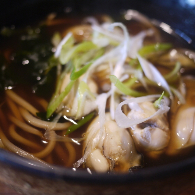 厚岸産の牡蠣が10個ほど入った牡蠣そば。蕎麦は、毎週十勝地方から届く蕎麦粉を手打ちしてつくる太めの田舎そば。つゆは、祖母直伝の鰹と目昆布だしです。