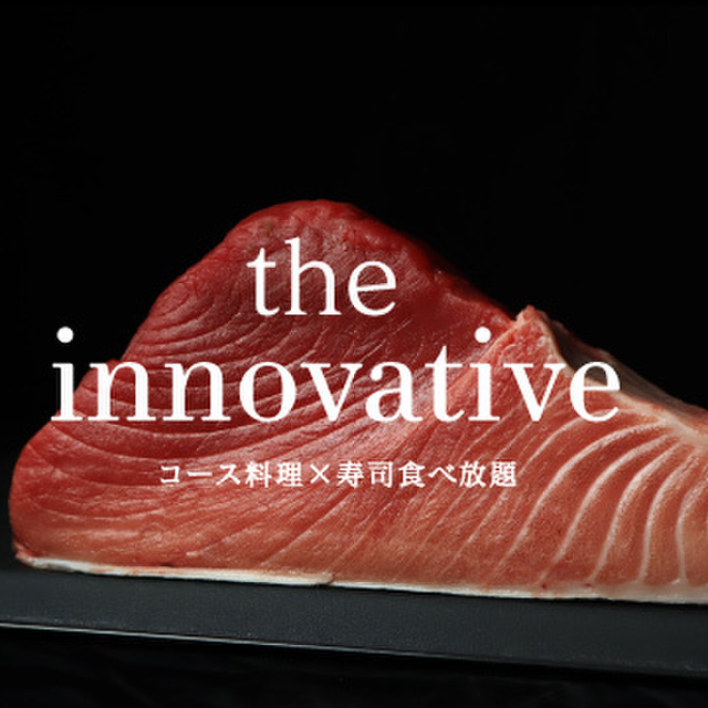生本マグロ・小皿料理・前菜・メイン・デザートとつながる革新的なという意味をもつinnovativeコース。コースの途中には、お寿司の食べ放題が楽しめます。食べ放題は、お寿司46種類・逸品料理13種類で食べ放題の時間はおよそ60分です。