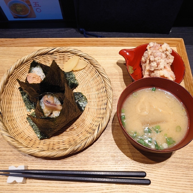 - むすびやセット〈大葉すじこ・海苔佃煮チーズ〉唐揚げ・味噌汁付き 870円