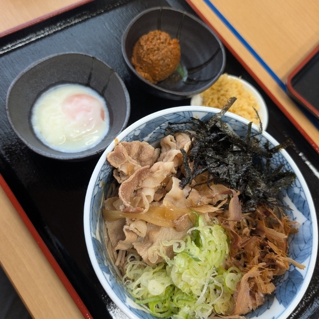 お蕎麦にかたくならないように低温で調理した豚バラ肉、粘り気の強い大和芋とサラッとした喉ごしの長芋を合わせたとろろ、温泉卵をトッピングした常連さんにも根強い人気の一品。
