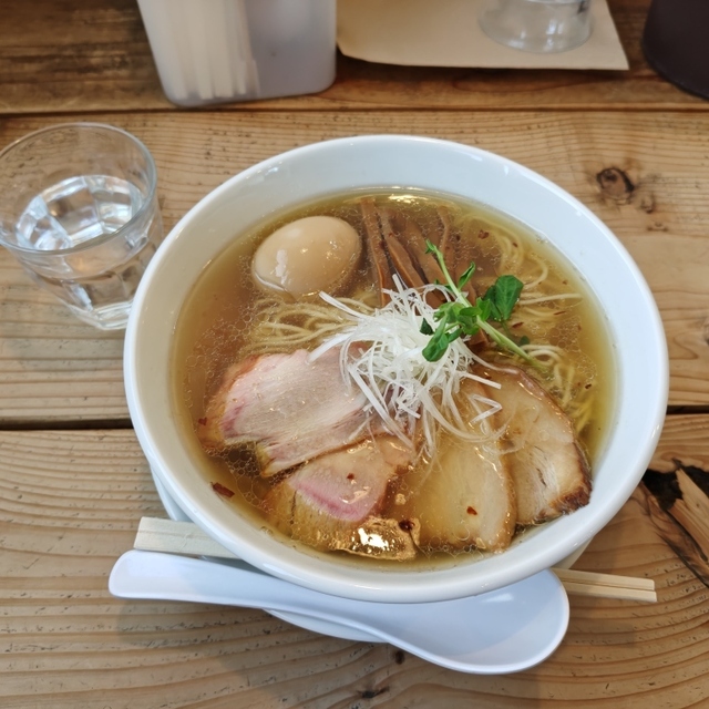 名古屋コーチン・大山どり・合鴨・親鶏を煮詰めた鶏ガラスープ、背骨・大腿骨をチャーシューの煮汁で煮込んだとんこつスープ、かつお節・さば節・うるめ節・煮干し2種類・干し椎茸・昆布・花がつおからつくった和出汁、トリプルスープが味の決め手!スープは、3種類のスープを注文が入ってからブレンドし、塩だれ・香味油・鶏油・焦がしねぎと合わせています。麺は、北海道産小麦「ゆめちから」を使った自家製麺を使用。チャーシュー2種(豚バラ・肩ロース)・メンマ・白髪ねぎがトッピングされています。