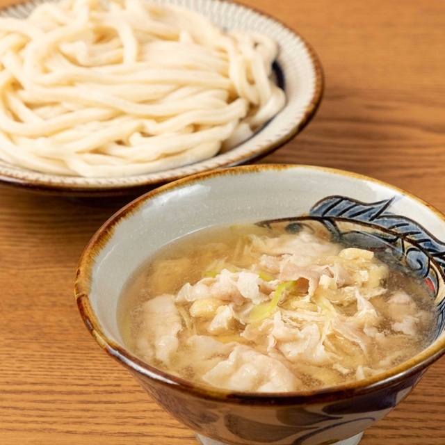 麺は水分少なめでつくることで硬くてコシが非常に強く、噛めば噛むほど小麦の風味が楽しめます。つけ汁は、かつお節・昆布など複数の素材をブレンドしたこだわりの出汁に創業1795年の兵庫県の蔵元でつくられた味わいを極限まで引き立たせた醤油を合わせた特製の黒。そこに豚肉・ねぎ・油揚げ・背脂を加えて煮ています。食べ終わったらスープに二番だしを加えてスープ割りにしていただきます。
