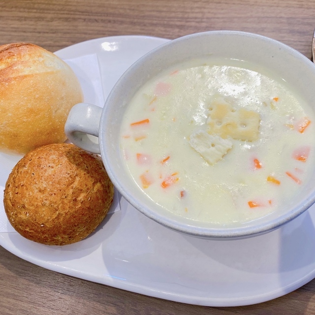 7種類の野菜がふんだんに入ったミネストローネと濃厚なオリジナルホワイトソースでつくったクラムチャウダーがセットになったWスープセット。