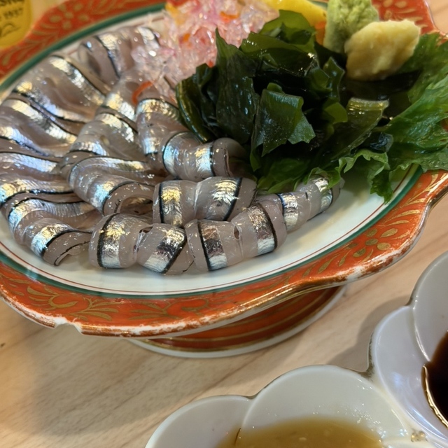 直径40センチの大きな丸い器の中に五島の海の幸と山の幸がぎっしりと詰め込まれたお店の名物。獲れたて新鮮な刺身の盛り合わせ(この日はカツオ、タコ、イカ、カンパチ)やカマスの焼き魚、野菜の炊き合わせ、天ぷらの盛り合わせと食べごたえ十分な一品です。